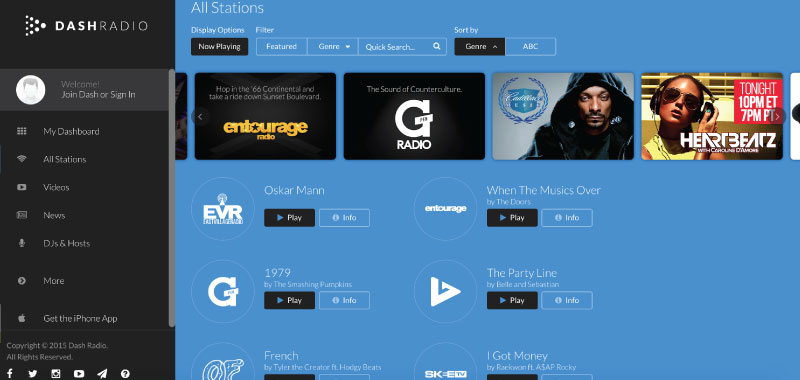 DashRadio is an internet radio website where you can stream free music. It is available with stations and different genres to fit your taste. Find any station by genre (including jazz, classical, world, hip-hop, pop, and Latin) and add them to your profile for future returns.
